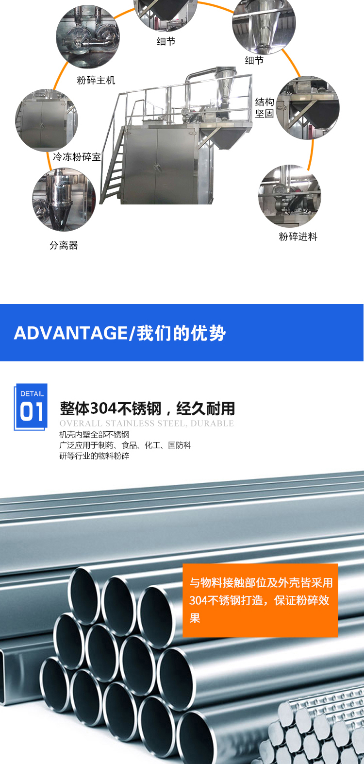 本機可廣泛應用于制藥、食品、化工、國防科研等行業(yè)的物料粉碎,特別對熱敏性物質,精細化工、中醫(yī)藥、動植物等及在常溫下呈韌性、無法粉碎的物料。深冷粉碎就是先把上述物質采用液氮冷凍到脆化點以下,然后在粉碎機內被粉碎到所需的細度,而且原成分不會被破壞。并且在常溫下易燃易爆的物質,也能低溫粉碎,效果更為顯著