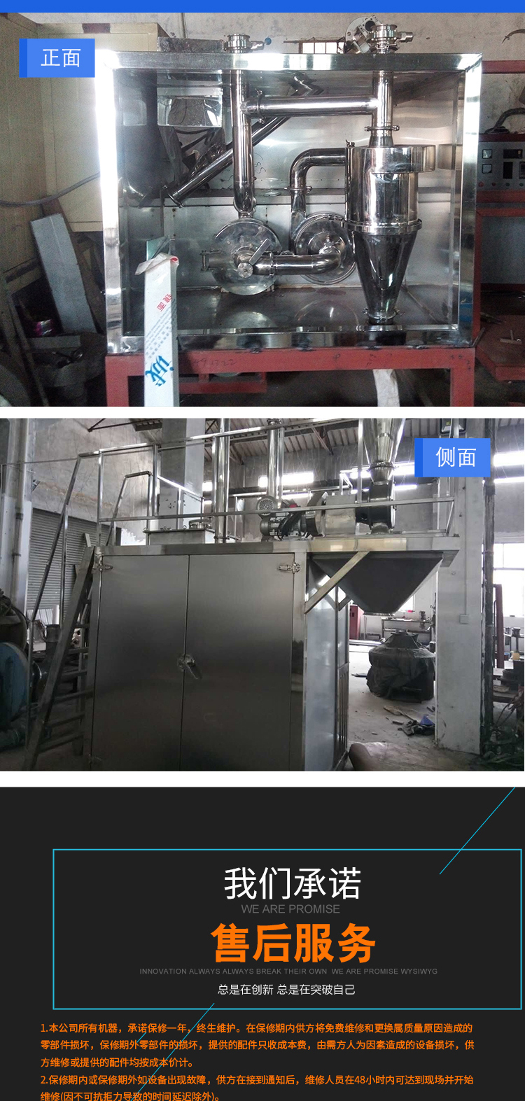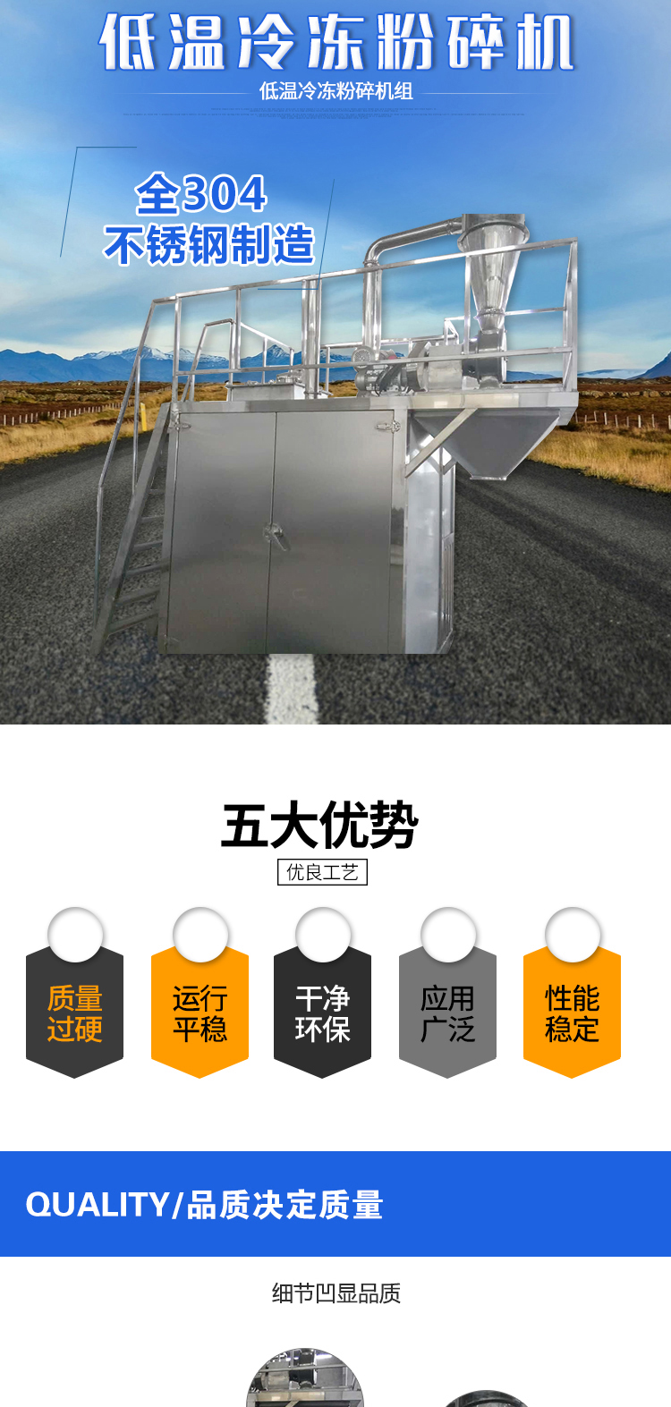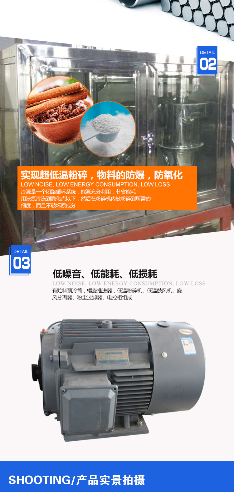 本產品具有貯料預冷筒,螺旋推進器,低溫粉碎機、低溫鼓風機、旋風分離器、粉塵過濾器、電控柜組成。