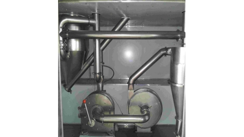 該深冷粉碎機系統(tǒng)以液氮為冷源,被粉碎物料通過冷卻在低溫下實現(xiàn)脆化易粉碎狀態(tài)后,進入機械粉碎機腔體內通過葉輪高速旋轉,物料與葉片,齒盤,物料與物料之間的相互反復沖擊,碰撞,剪切,摩擦等綜合作用下,達到粉碎效果,冷氣大部分返回料倉循環(huán)使用。