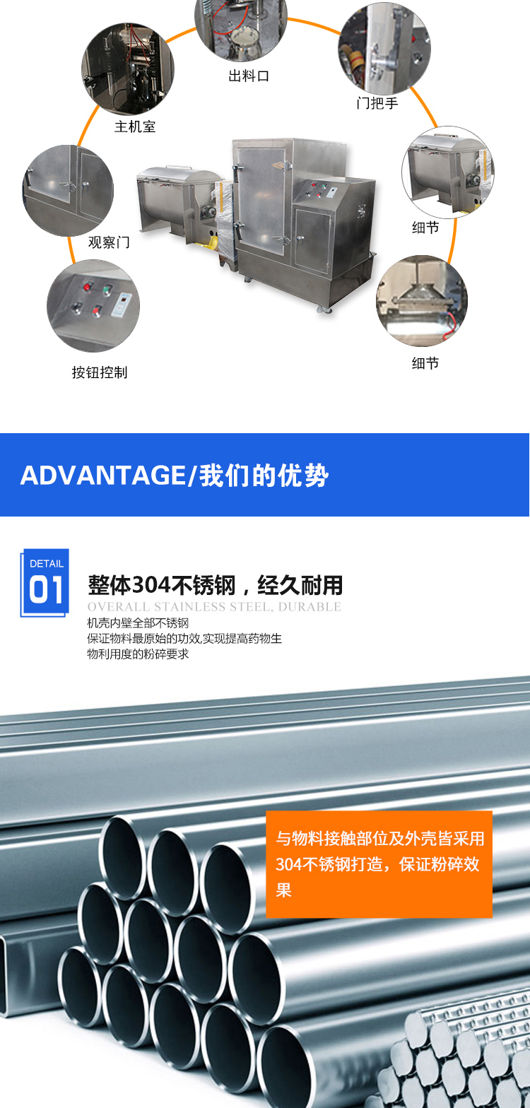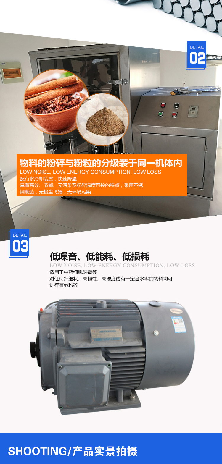 本機(jī)對(duì)任何纖維狀、高韌性、高硬度或有一定含水率的物料均可進(jìn)行有效粉碎,特別適用于中藥細(xì)胞破壁等旨在提高藥物生物利用度的粉碎要求及用常規(guī)方法無法達(dá)到要求細(xì)度的物料。