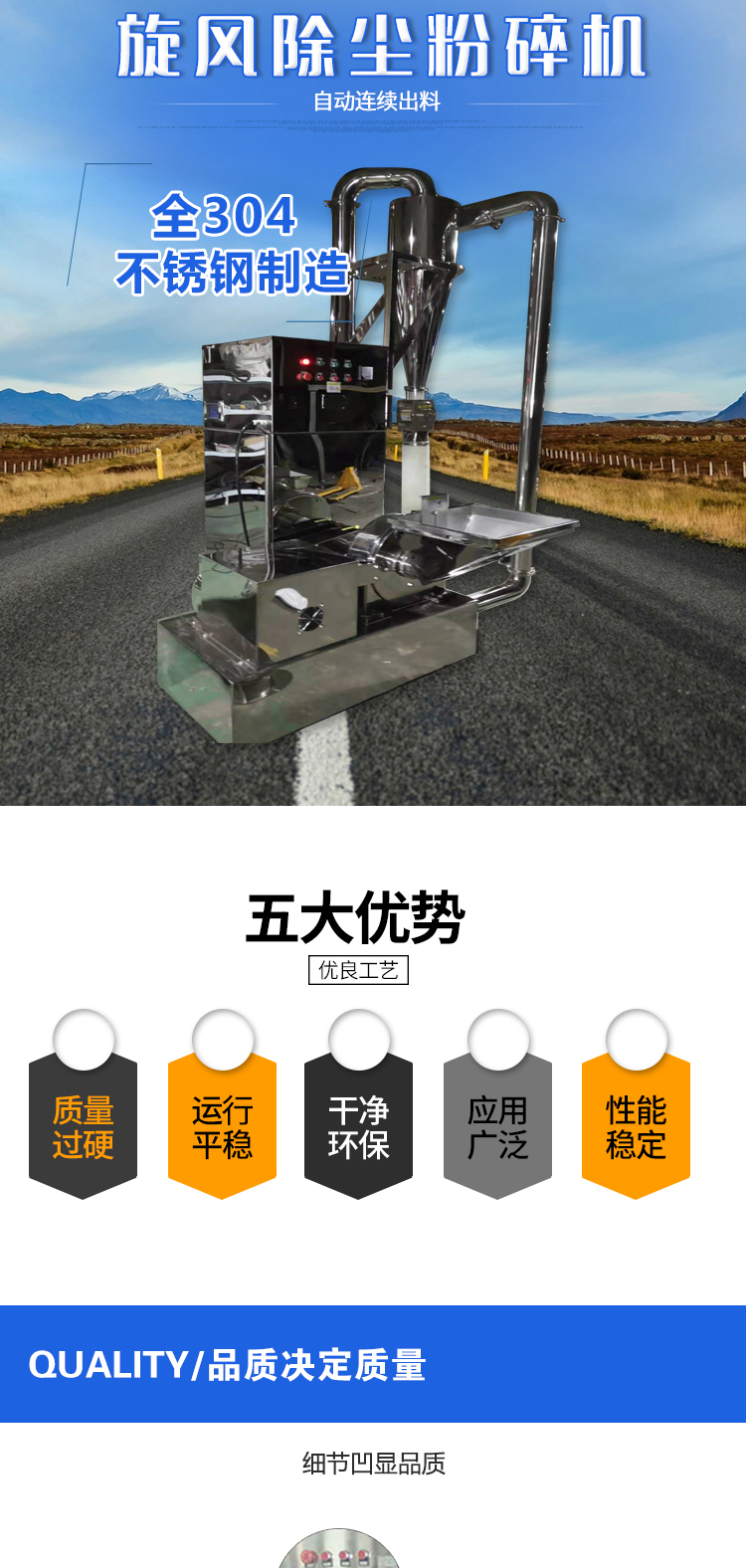 旋風(fēng)除塵粉碎機組是我公司新研制的除塵設(shè)備,新穎大方、全不銹鋼制作、結(jié)構(gòu)緊湊、生產(chǎn)效率高、降低生產(chǎn)成本且提高生產(chǎn)效力,基本無易損件,操作簡便。該機組設(shè)計原理合理,能粉碎各種纖維性較強的物料,非常適合五谷雜糧溫控合理,過濾回收率在99.8%以上。