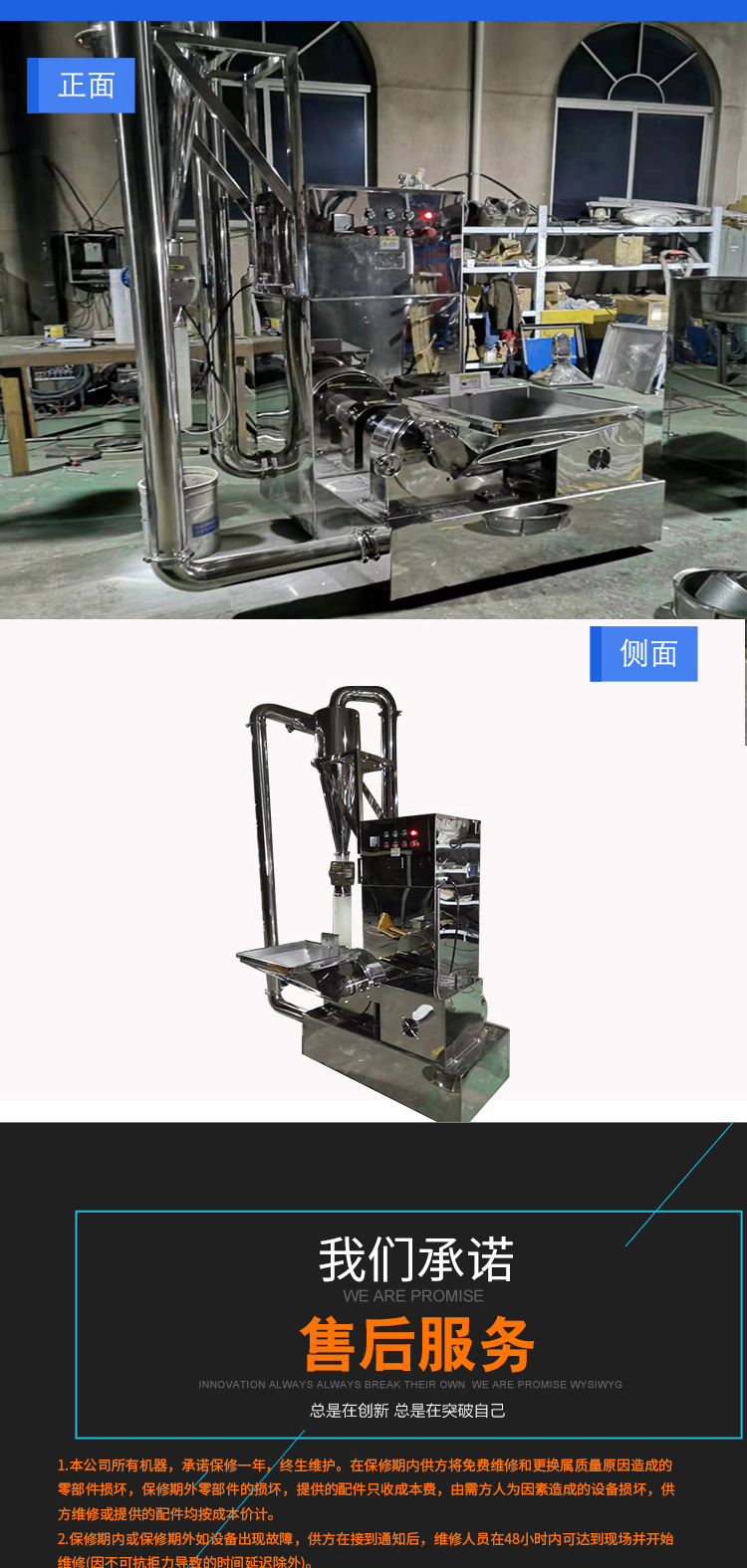 該機由加料斗,篩網(wǎng),粉碎刀片,齒圈,粉碎電機,出料口,風(fēng)葉,集料箱,吸塵箱等部分組成,物料由加料斗進(jìn)入粉碎室,通過高速旋轉(zhuǎn)的刀片進(jìn)行粉碎,更換不同型號的篩網(wǎng)來達(dá)到所要求的物料細(xì)度,高速旋轉(zhuǎn)的風(fēng)葉把達(dá)到要求的物料從粉碎室引到集料箱布袋中,沒有達(dá)到要求的物料繼續(xù)在粉碎室中粉碎,集料箱布袋產(chǎn)生的粉塵由吸塵箱收集,該機組按“GMP”標(biāo)準(zhǔn)設(shè)計,結(jié)構(gòu)簡單,操作清理方便,噪音小,產(chǎn)量高,機器采用不銹鋼材料制作,粉碎過程中無粉塵飛揚