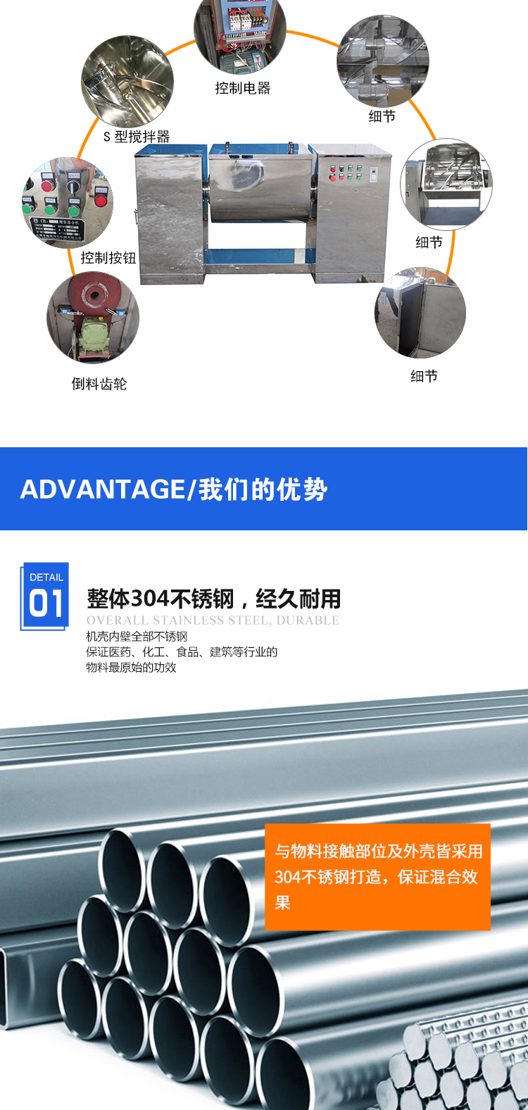 本機通過機械傳動,使S式攪拌槳旋轉(zhuǎn),推動物料往復(fù)翻動,均勻混合,操作時采用電氣控制,可設(shè)定混合時間,到時自動停機,電動倒料,從而提高每批物料的混合質(zhì)量,達到高均勻度的混合。