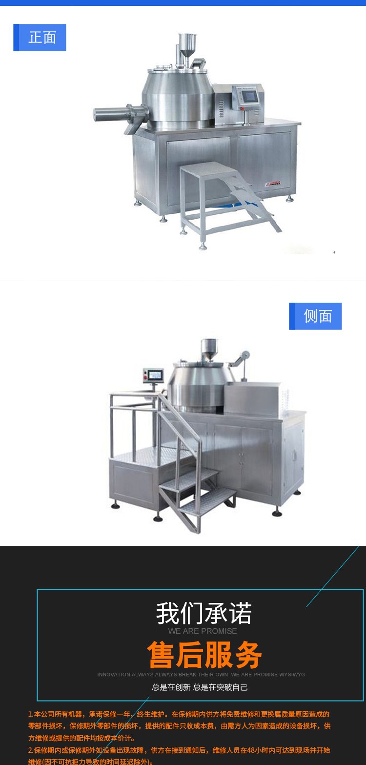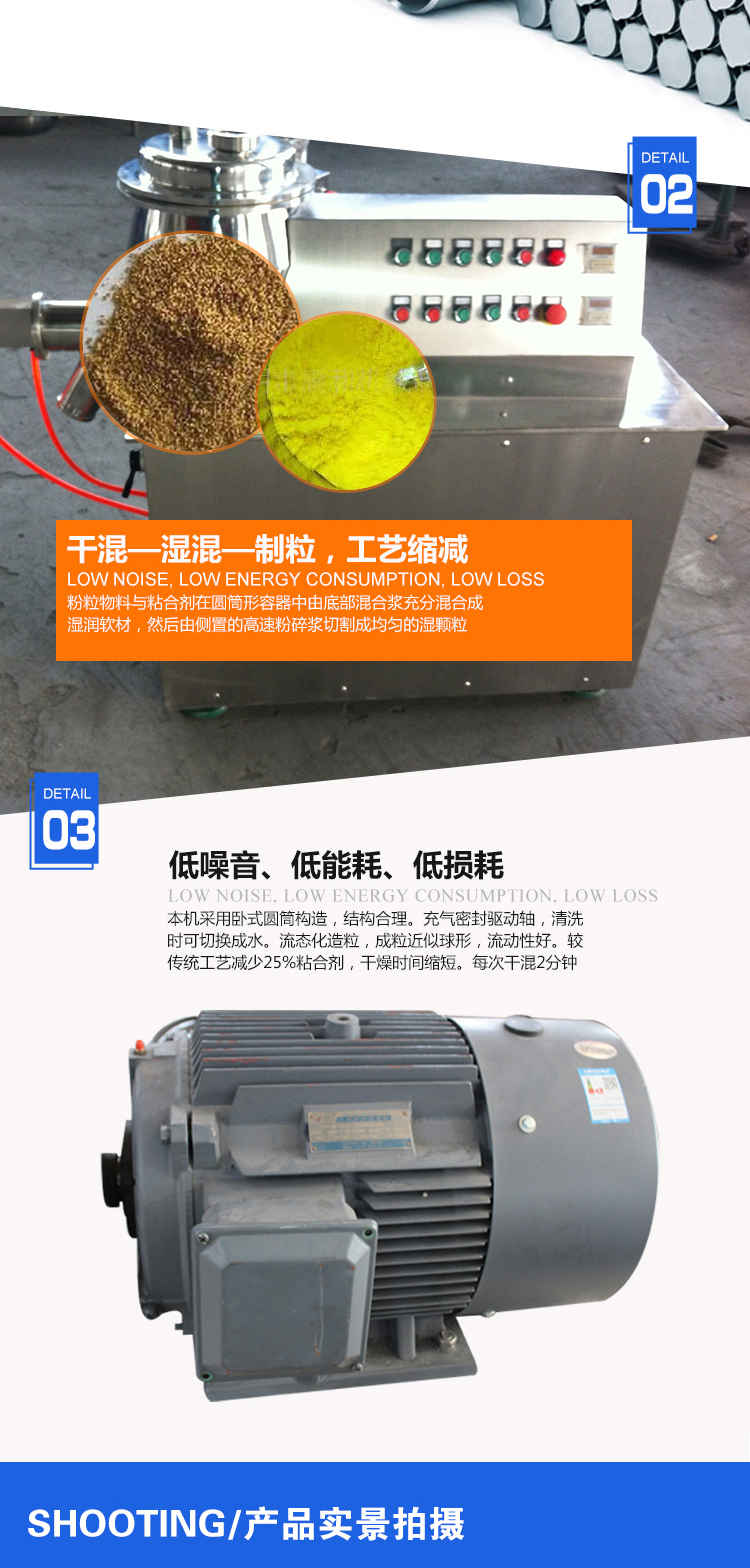 本機(jī)采用臥式圓筒構(gòu)造,結(jié)構(gòu)合理。充氣密封驅(qū)動(dòng)軸,清洗時(shí)可切換成水。流態(tài)化造粒,成粒近似球形,流動(dòng)性好。較傳統(tǒng)工藝減少25%粘合劑,干燥時(shí)間縮短。每次干混2分鐘,造粒1—4分鐘,功效比傳統(tǒng)工藝提高4—5倍。在同一封閉容器內(nèi)完成,干混—濕混—制粒,工藝縮減,符合GMP規(guī)范。整個(gè)操作具有嚴(yán)格的安全保護(hù)措施。